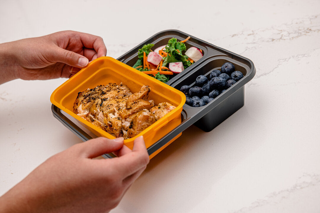 Every meal prep container on the market forces you to microwave everything — or pack two separate containers. Meal Clickit has a patent-pending removable entree section. Snap it out. Heat it. Snap it back. Hot chicken, cold greens, one container.
